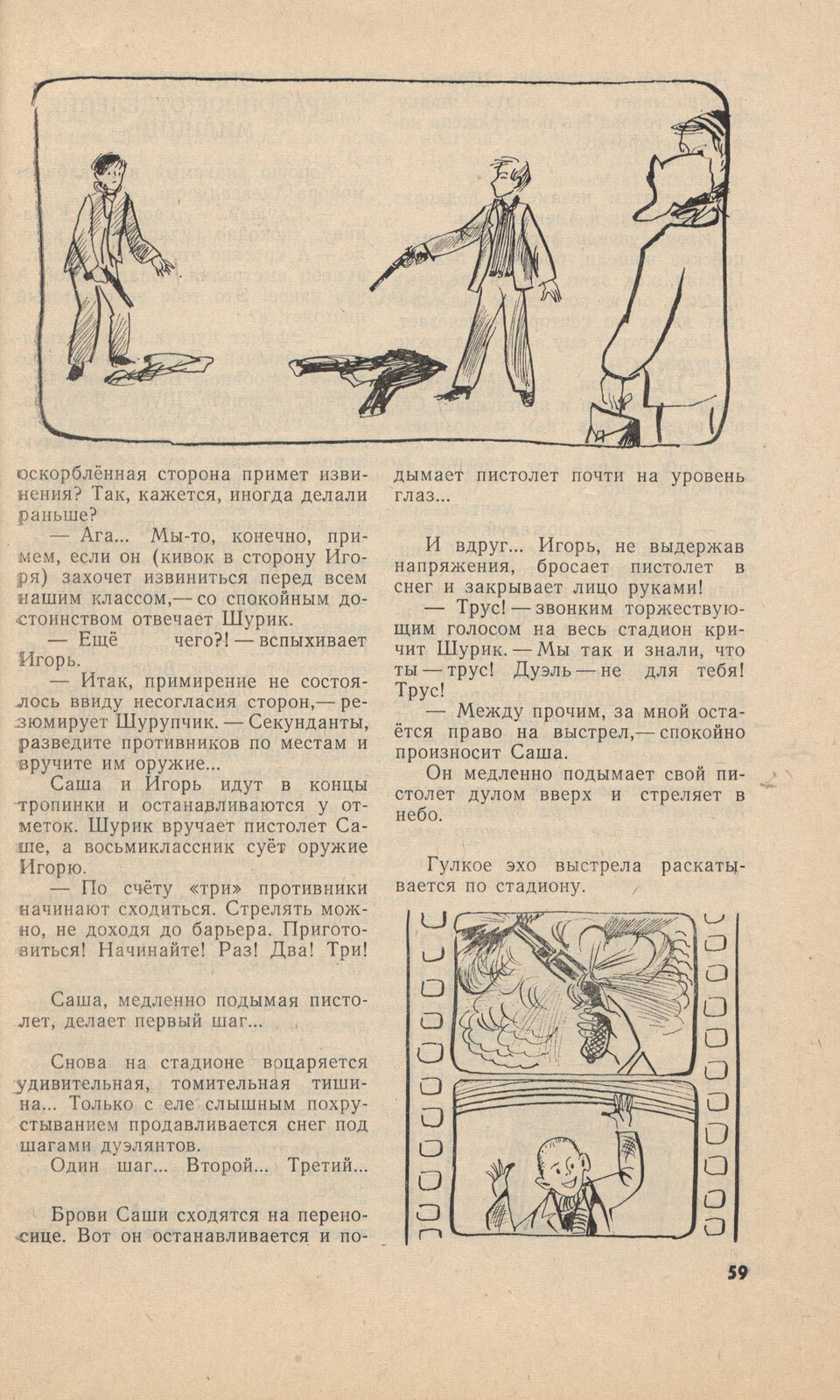 Несмотря на первоначально шаткие обоснования, с каждым новым поединком смертоносная дуэльная логика обретает все больший смысл, превращаясь из сомнительного метода решения конфликтов в своего рода жизненную философию. Не случайно в финальной серии пистолеты оказываются уже в руках старшего поколения, казалось бы, совершенно не приспособленного к таким вызовам и погрязшего в мещанских дрязгах. А вот и нет: дуэль — это, конечно, для тех, кто вырос в девяностые и когда-то сверял силу с правдой. Смешно, но в упомянутой выше повести Куклина оскорбленный Шурупчик сперва решает сконструировать дуэльный пистолет самостоятельно. И выходит у него DIY-самострел конструкции Данилы Багрова.